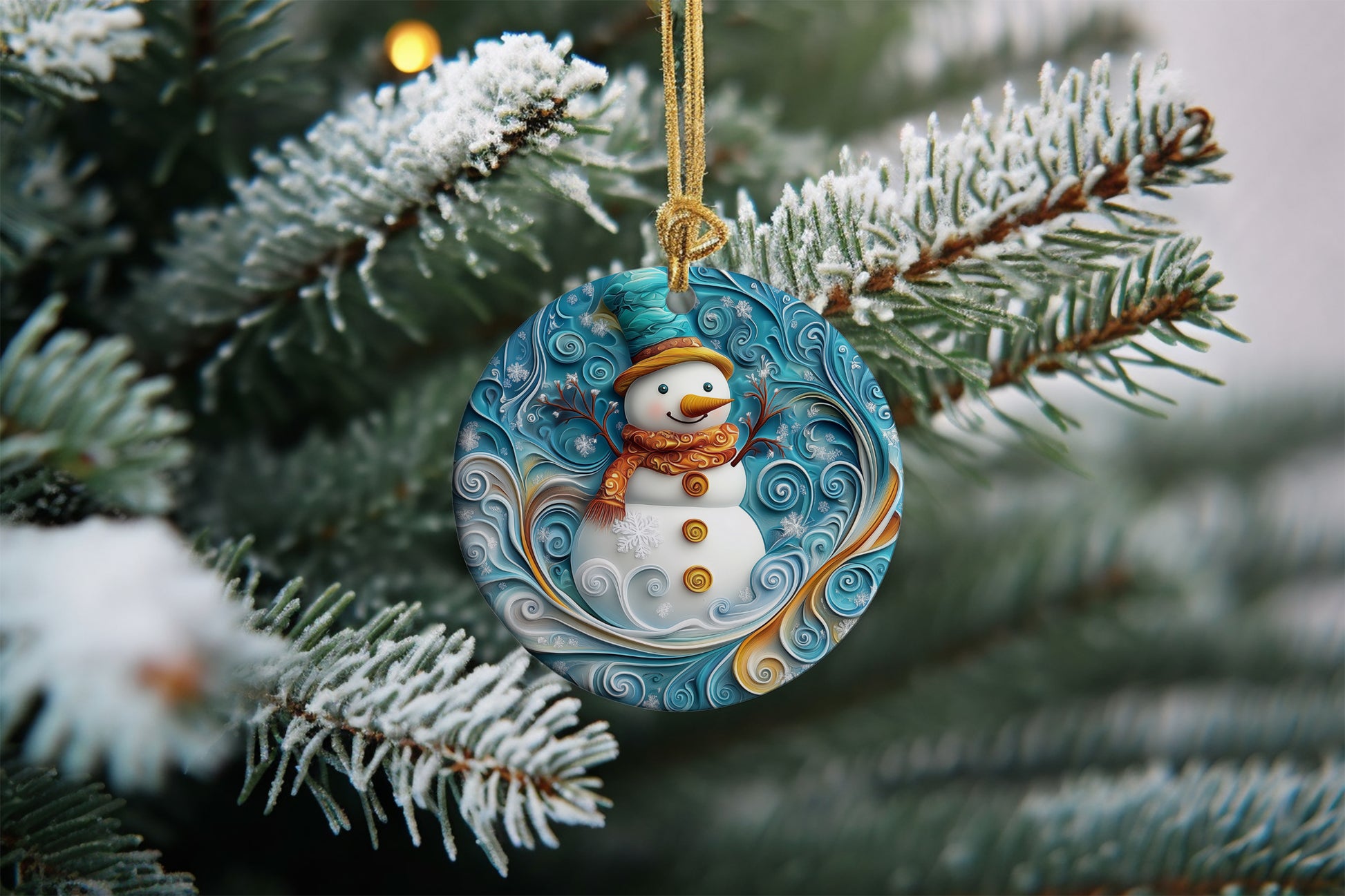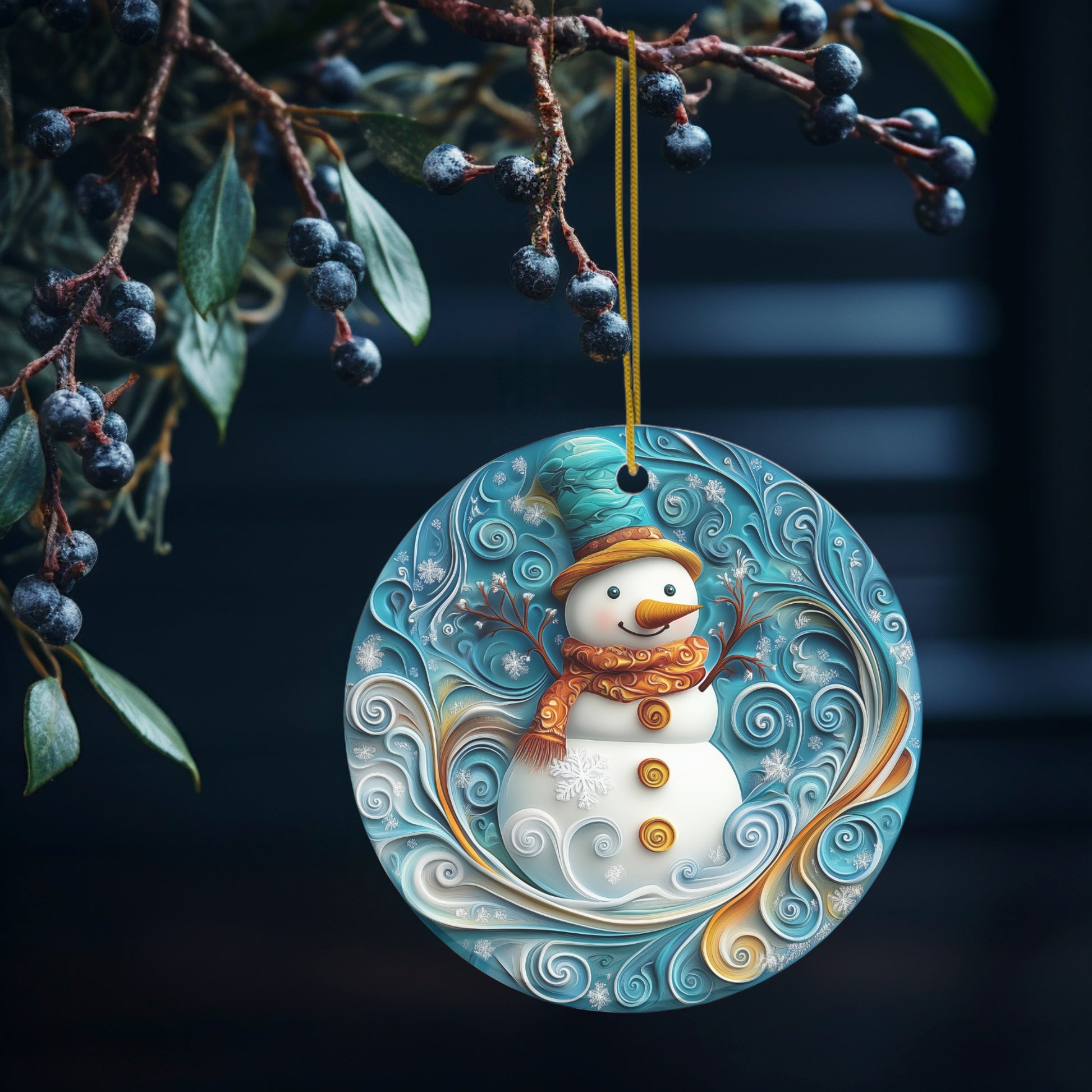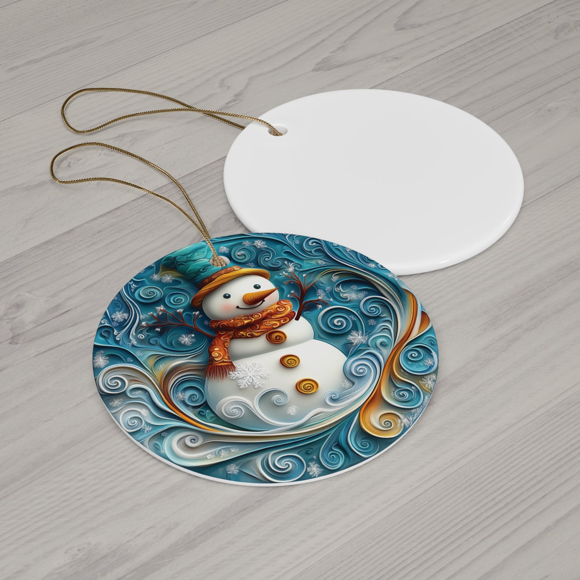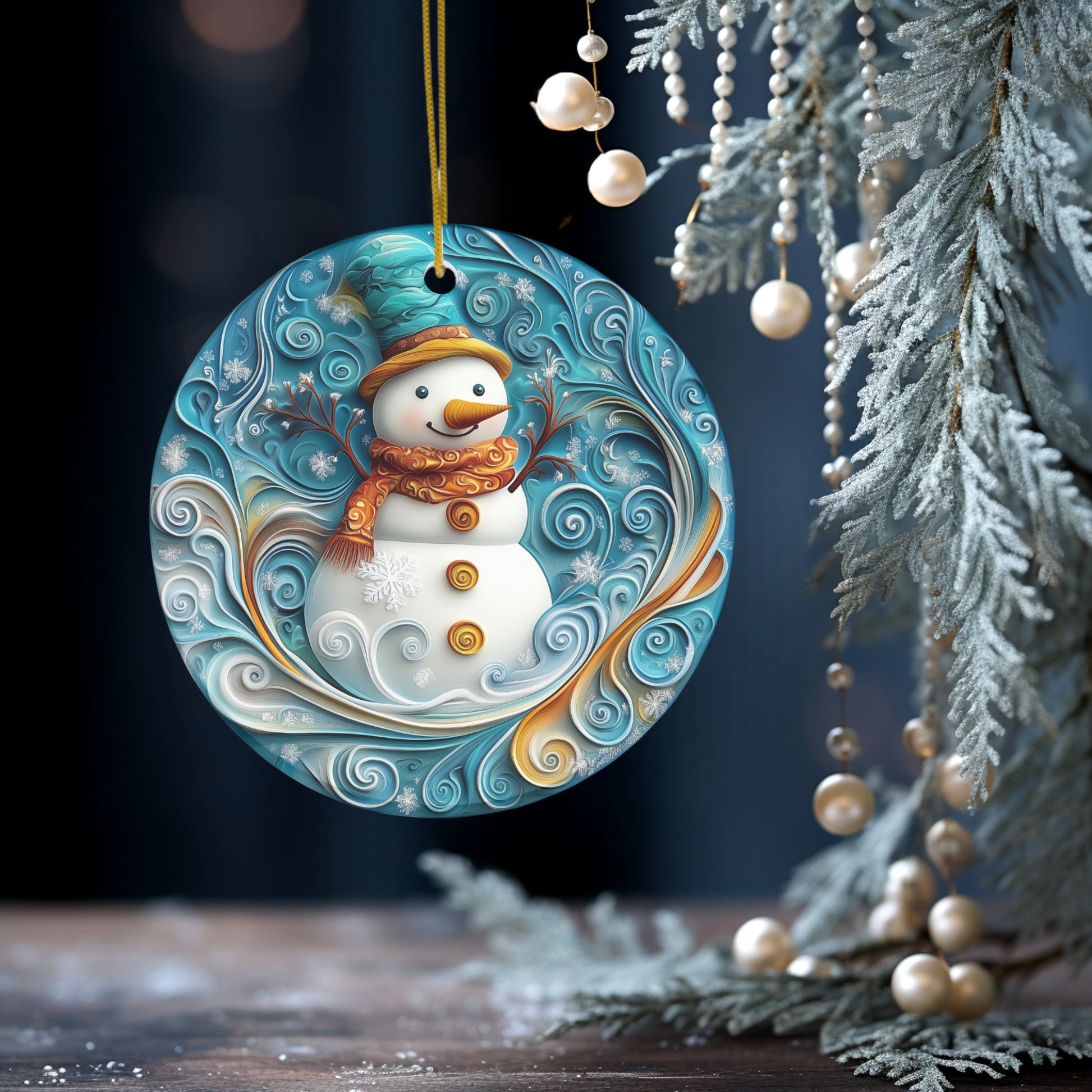 Add a touch of elegance to your holiday décor with this 3-inch round ceramic ornament, featuring a charming snowman wearing a stylish blue top hat. Surrounding the snowman are intricate, swirling blue patterns that evoke a sense of winter magic. The design incorporates a 3D-like effect, giving depth and dimension to the delicate details. This ornament is perfect for creating a sophisticated and festive atmosphere on your tree or as a thoughtful gift for loved ones.