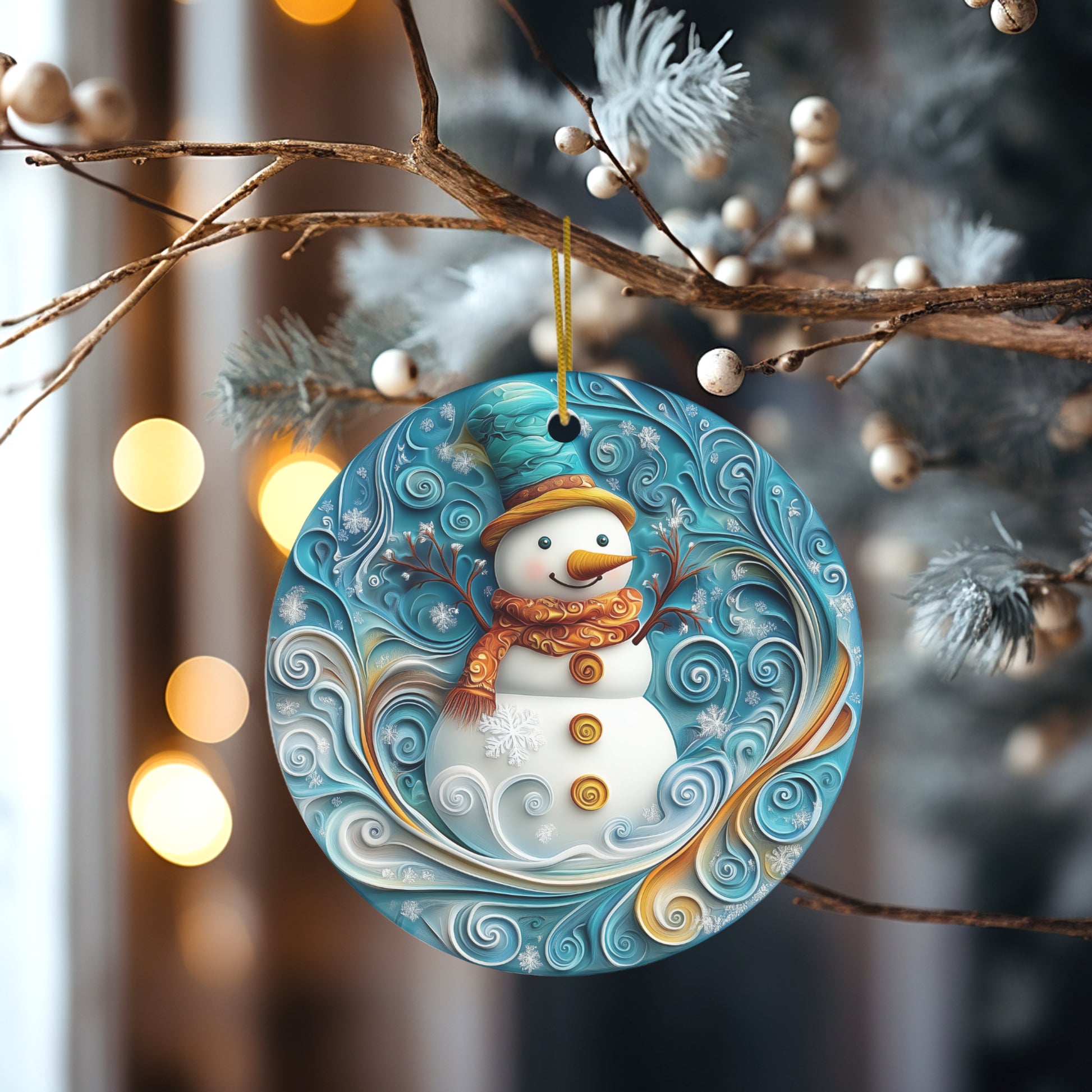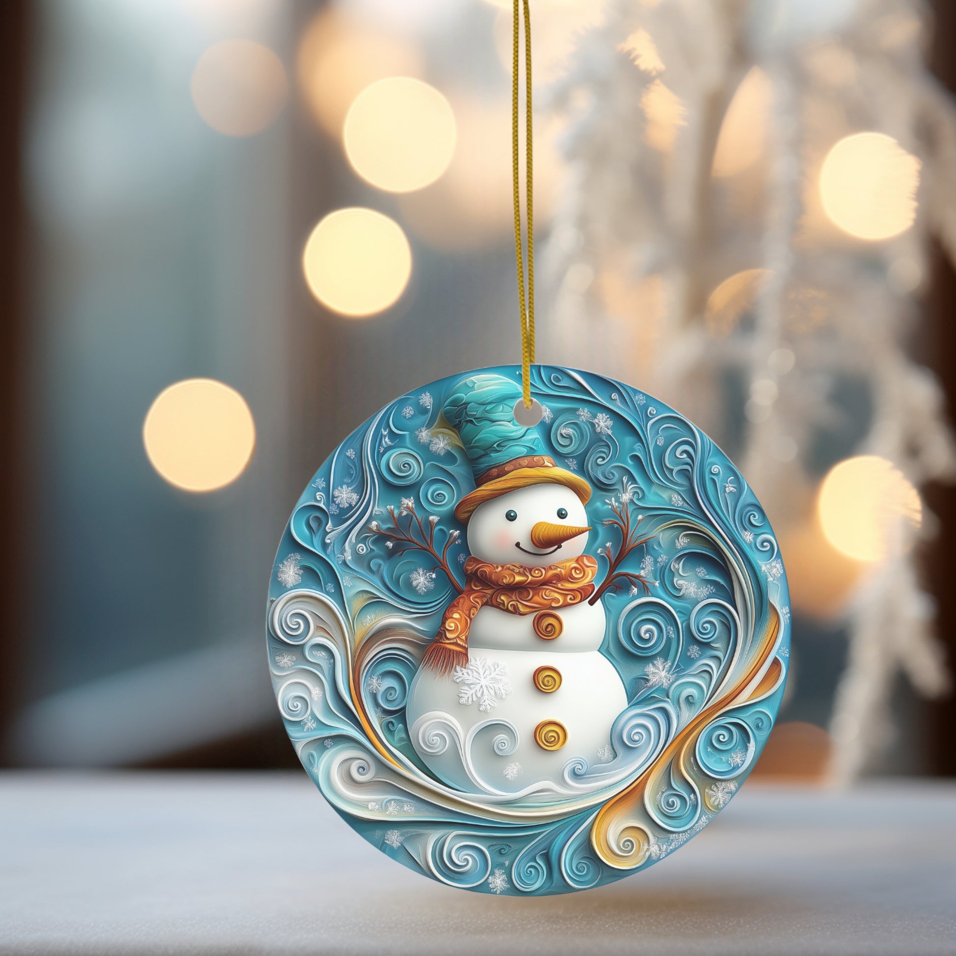 ⛄ 3" round shaped flat ceramic ornament with a 3d like design effect.