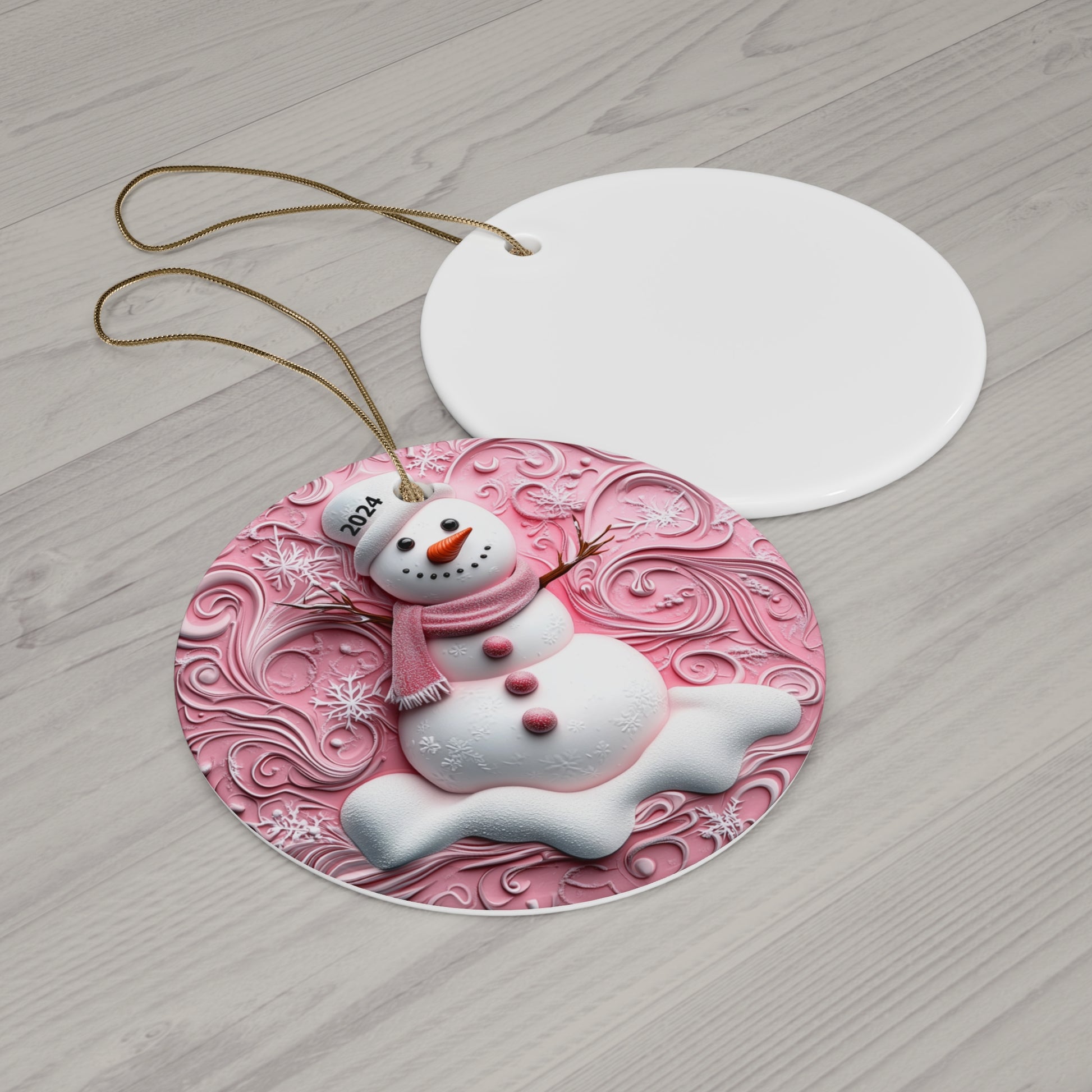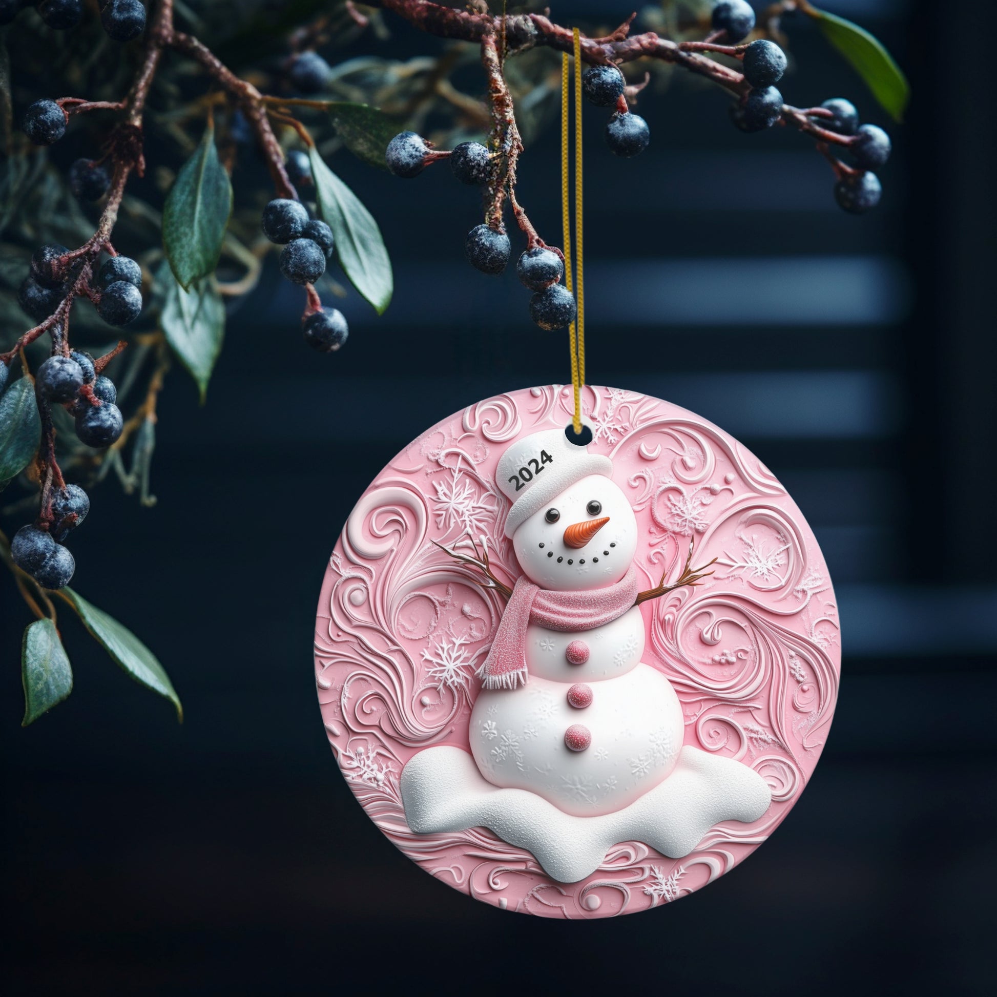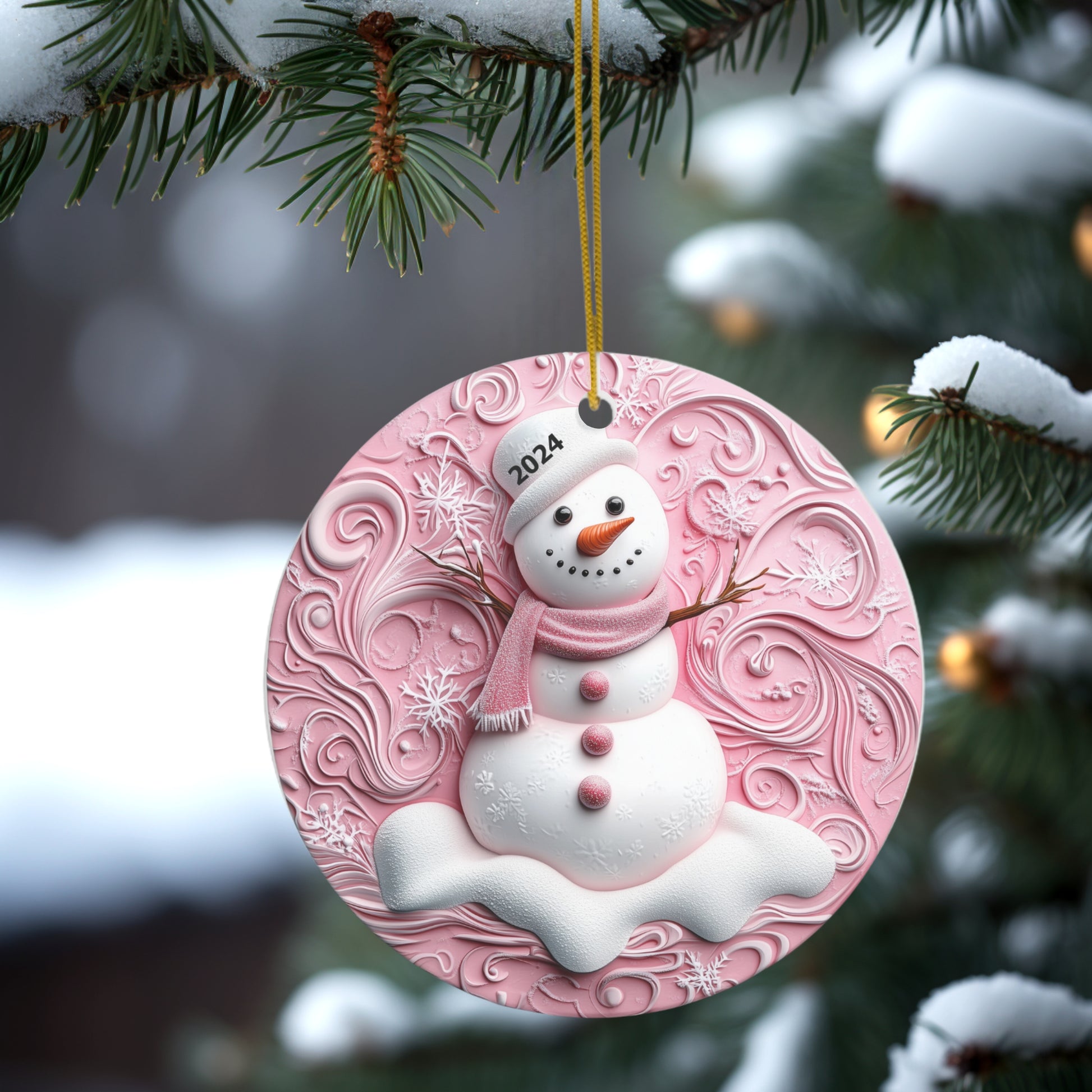Add a touch of festive charm to your holiday décor with this delightful 3-inch round ceramic snowman ornament! The snowman features a cheerful smile and cozy pink scarf, perfectly complemented by a whimsical backdrop of soft pink swirls and delicate white snowflakes. The year "2024" is prominently displayed, making it a meaningful keepsake for this holiday season. The design incorporates a 3D-like effect, giving depth and dimension to the delicate details. Crafted with care, this ornament is lightweight yet durable, perfect for hanging on your Christmas tree or gifting to loved ones. Celebrate the season in style with this adorable, timeless decoration!