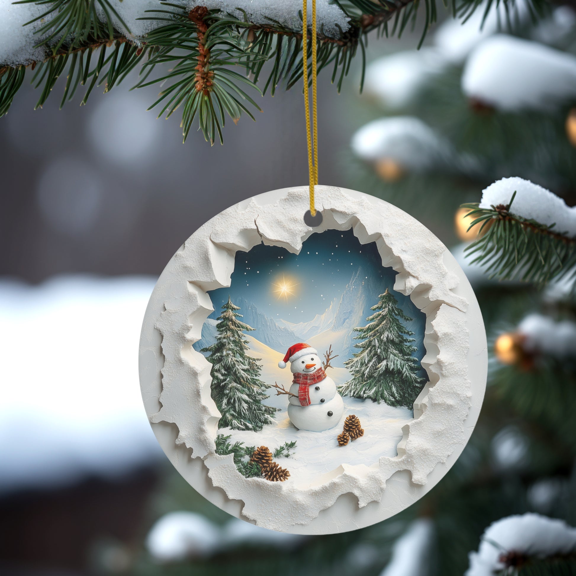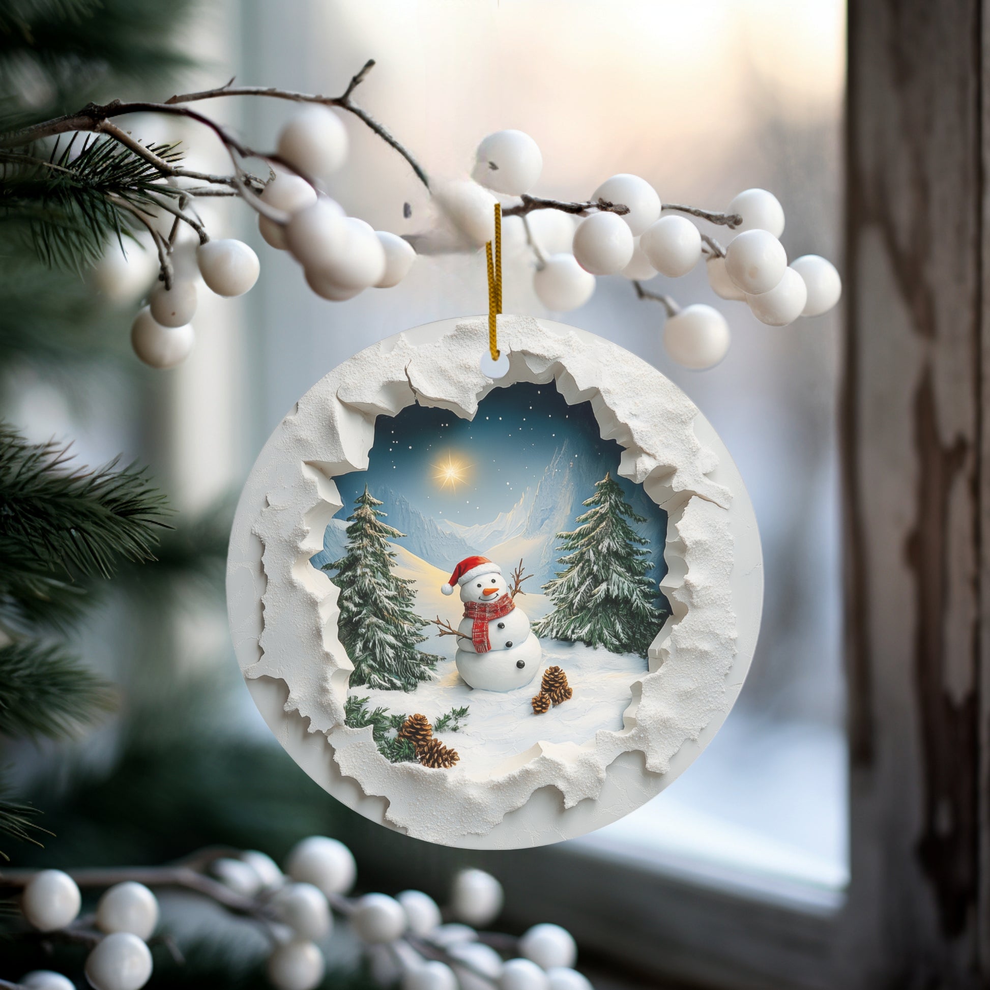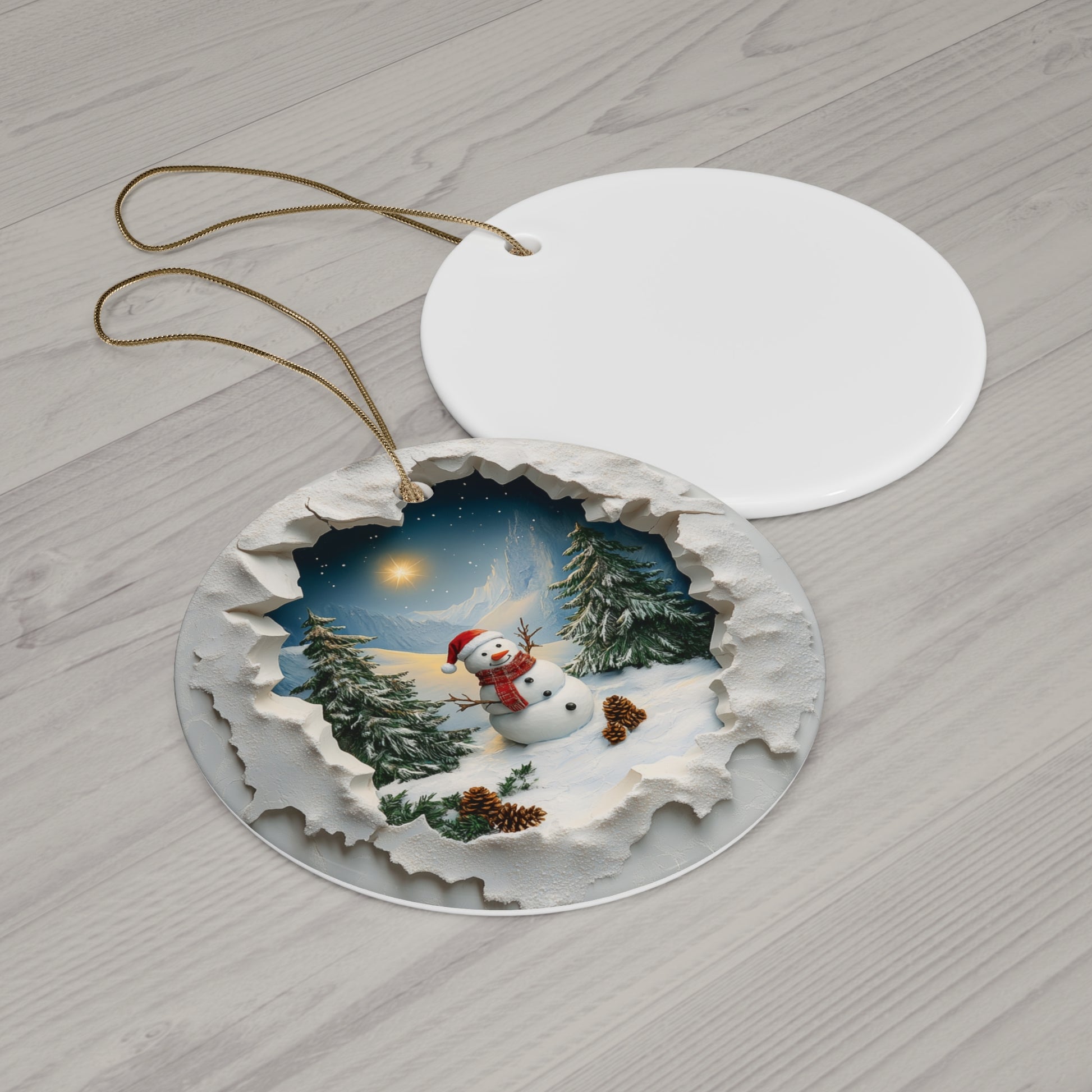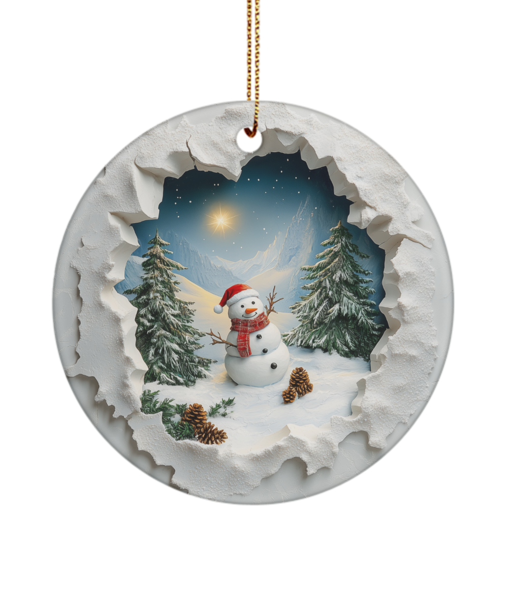 Capture the charm of winter with this 3-inch round ceramic ornament, featuring a delightful snowman donning a Santa hat. The snowman is surrounded by a serene mountain scene, complete with evergreen trees and pine cones. The unique design creates a stunning 3D-like effect, as if you’re peeking through a snowy "hole in the wall" to view this enchanting holiday landscape. Perfect for adding a cozy, festive touch to your tree or gifting to someone special this season!