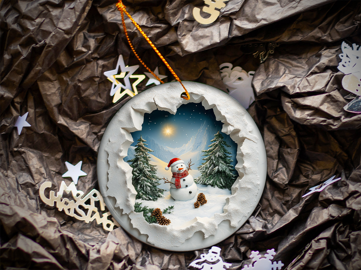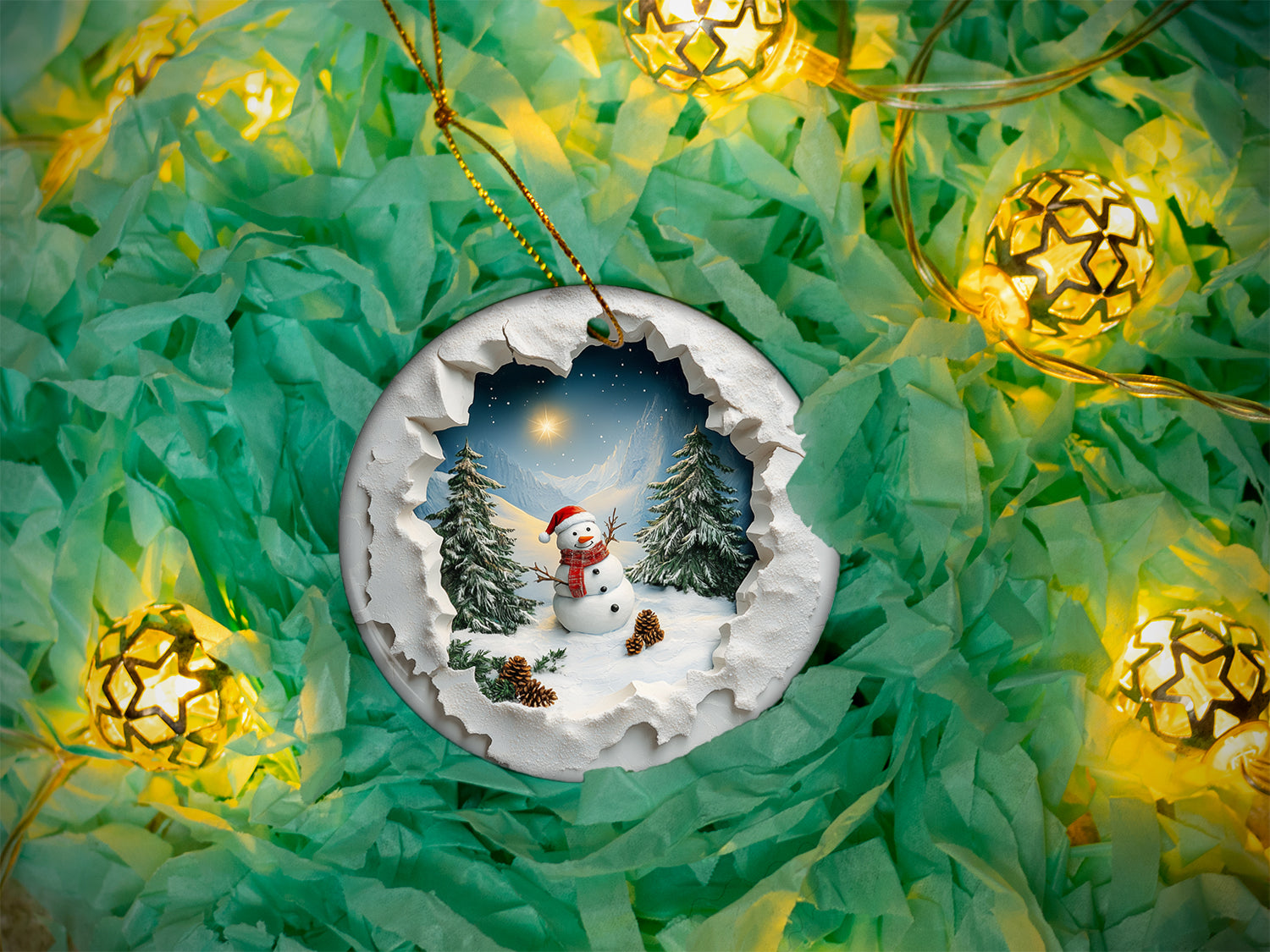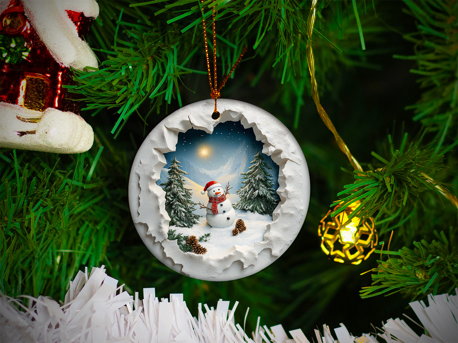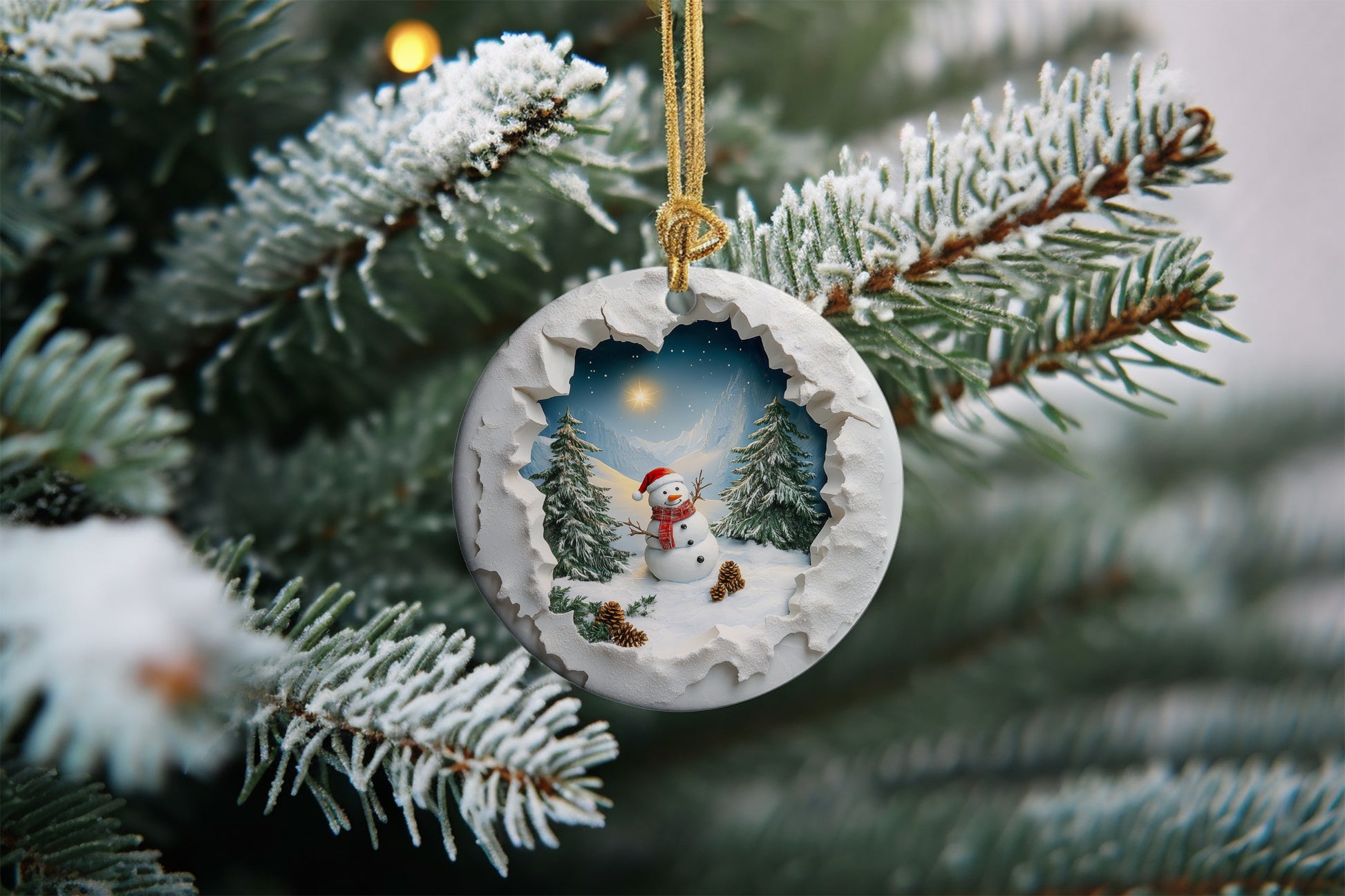 Capture the charm of winter with this 3-inch round ceramic ornament, featuring a delightful snowman donning a Santa hat. The snowman is surrounded by a serene mountain scene, complete with evergreen trees and pine cones. The unique design creates a stunning 3D-like effect, as if you’re peeking through a snowy "hole in the wall" to view this enchanting holiday landscape. Perfect for adding a cozy, festive touch to your tree or gifting to someone special this season!