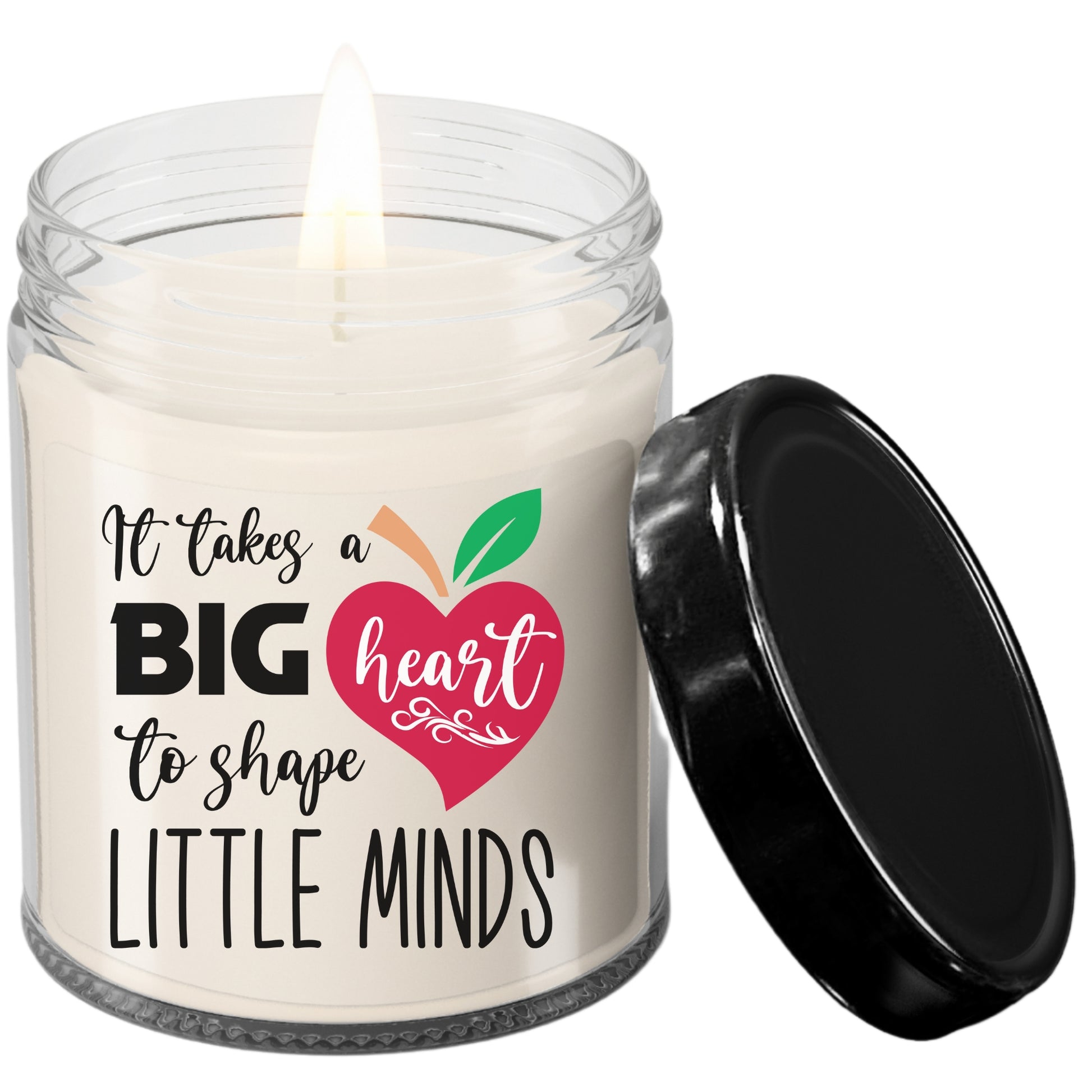 The candle is housed in a sleek and elegant glass jar, with a removable lid to keep the wax fresh and fragrant. The candle features a charming design with the words "It Takes A Big Heart To Shape Little Minds."