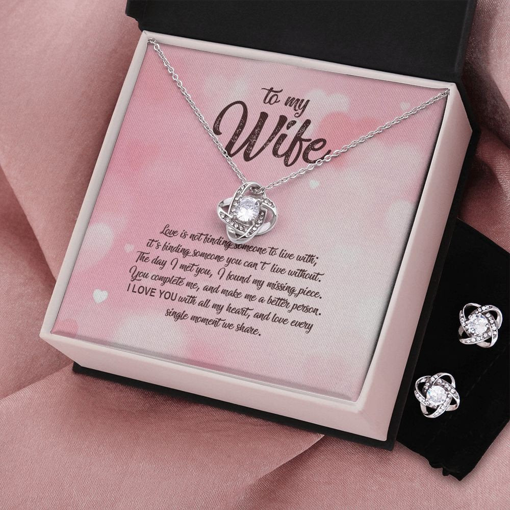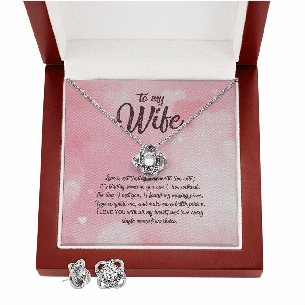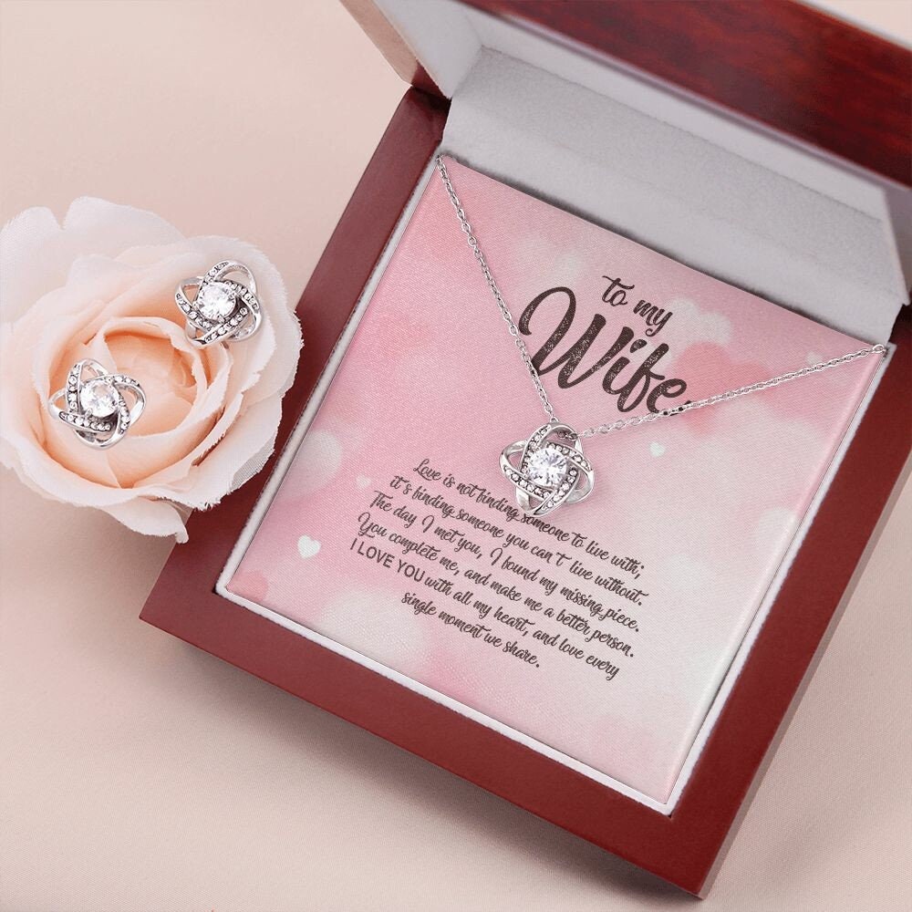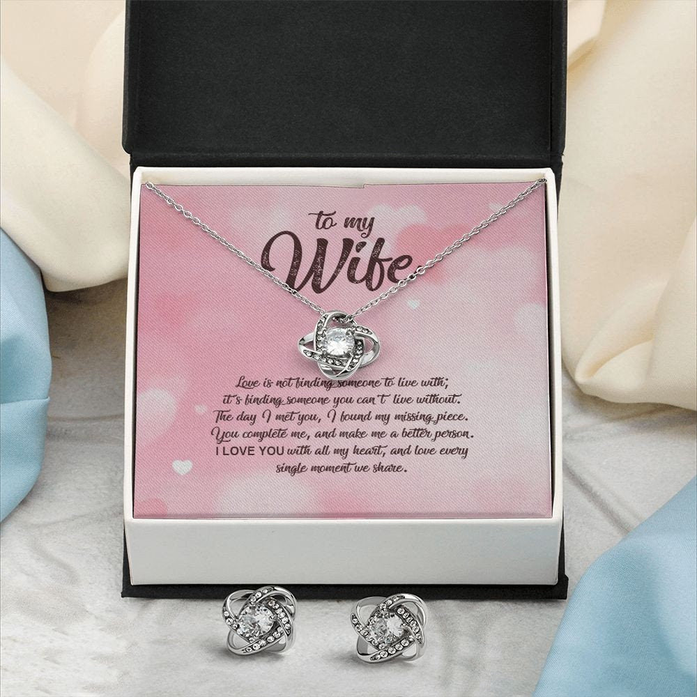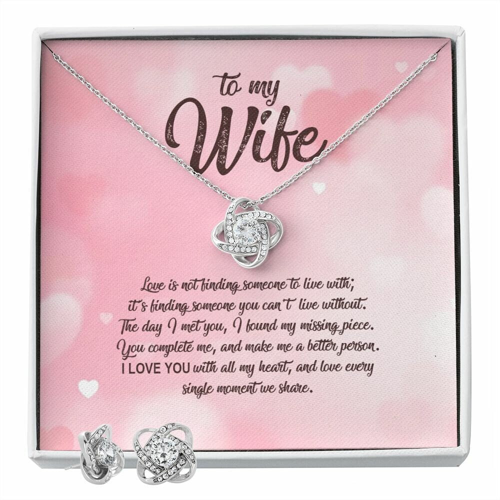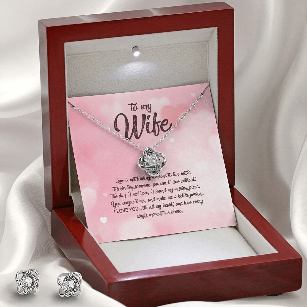 Need a special Valentine's Day gift, wedding anniversary, birthday, or Christmas gift for your wife? Imagine your wife's reaction when she sees this To My Wife Message Card with the Love Knot Earrings and Necklace Set. She can wear this set with pride any time of the year and know that she feels loved.